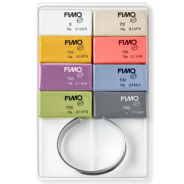 Ce coffret Fimo Soft couleurs tendances contient 8 pains de Fimo Soft de 25g ainsi qu’un support bracelet pour crĂŠer un bracelet tendance selon votre inspiration.
