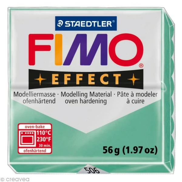 La pâte Fimo Effect Vert jade 506 est une pâte à modeler qui durcit en la passant au four (on parle de pâte polymère). AgrÊable à travailler car très mallÊable, cette pâte Fimo à effet Vert jade permet aux petits comme aux grands de rÊaliser diverses crÊations.